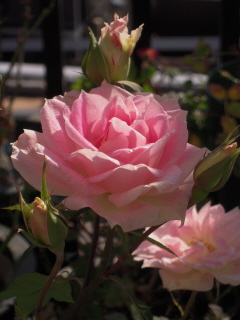後ろに見えるオレンジ色は名無しミニ薔薇ですが